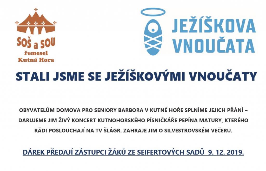 19. 11. 2019 se nám podařilo rezervovat si přání obyvatel z Domova pro seniory Barbora v Kutné Hoře. Po vzájemné domluvě na datu a způsobu předání dárku jsme se tak stali skutečnými Ježíškovými vnoučaty.