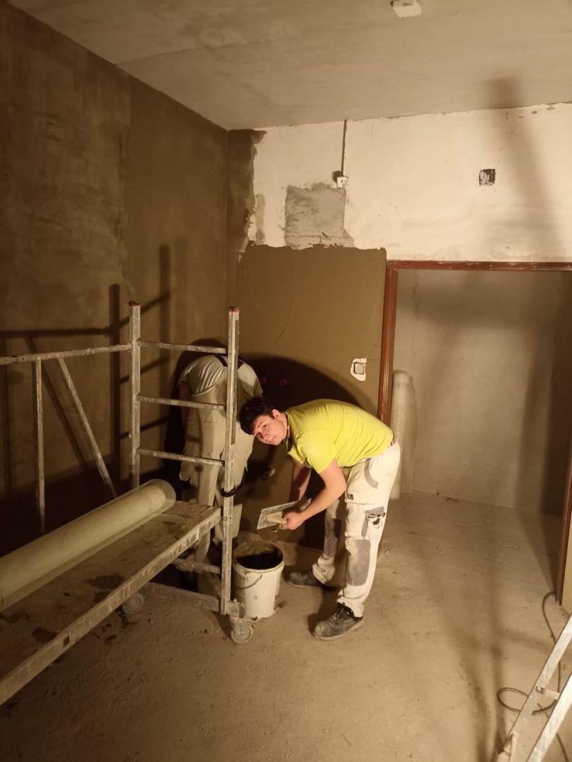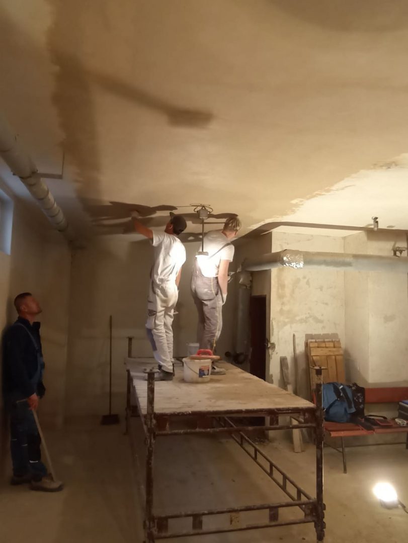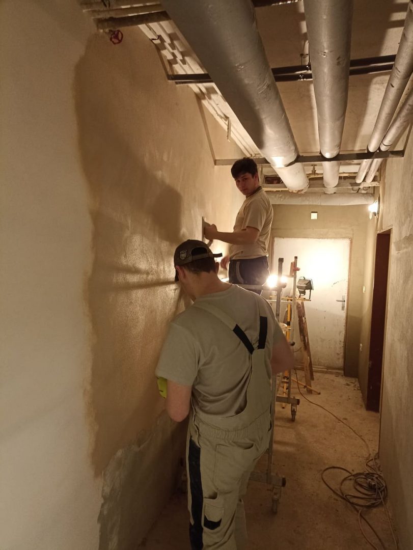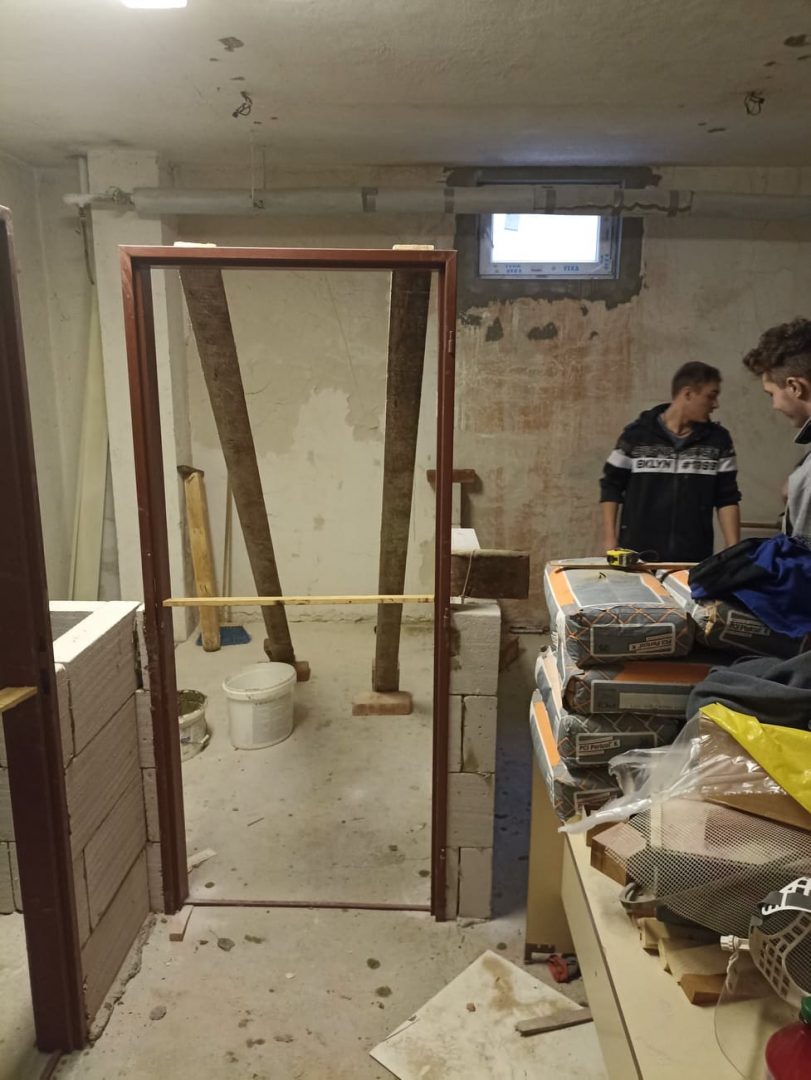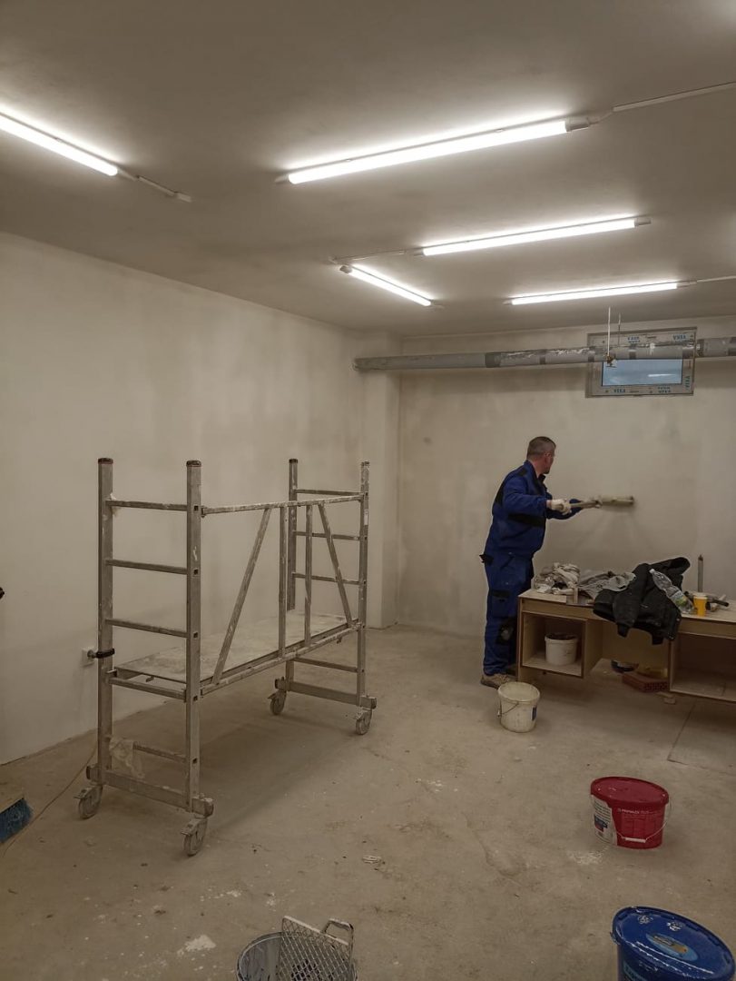 Po bouřlivém podzimu, kdy zakázka střídala zakázku, si přes zimu naší zedníci v teploučku upravují a dokončují svoje zázemí – šatny, sklad, učebnu a sociální zařízení (sprchu a WC) v suterénu DM na Čáslavské 202. S rozvodem elektrické energie a s osvětlením jim pomáhají naši elektrikáři.