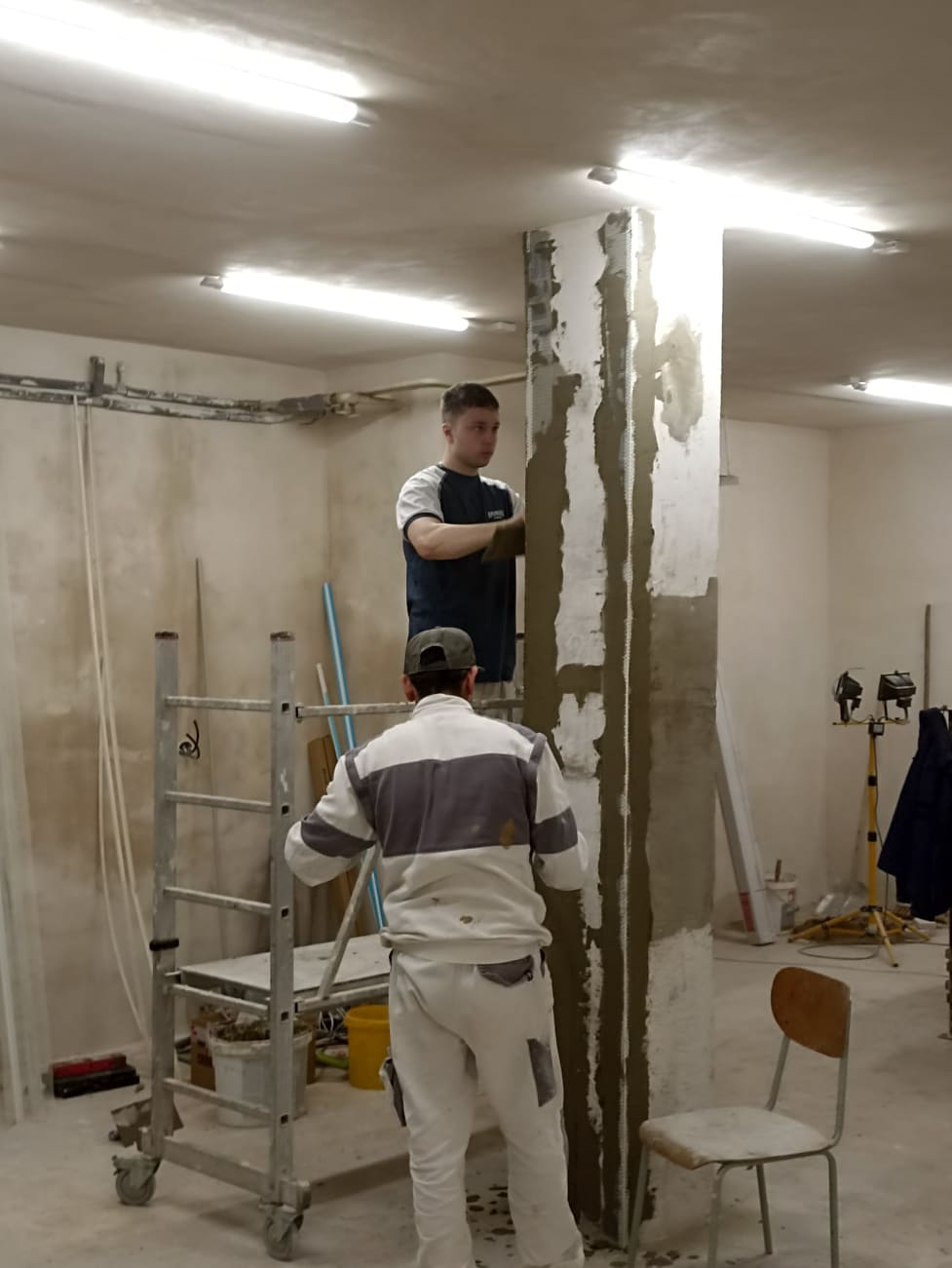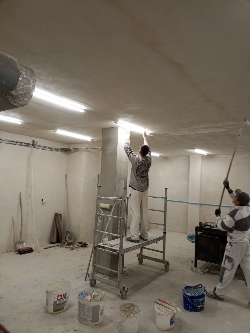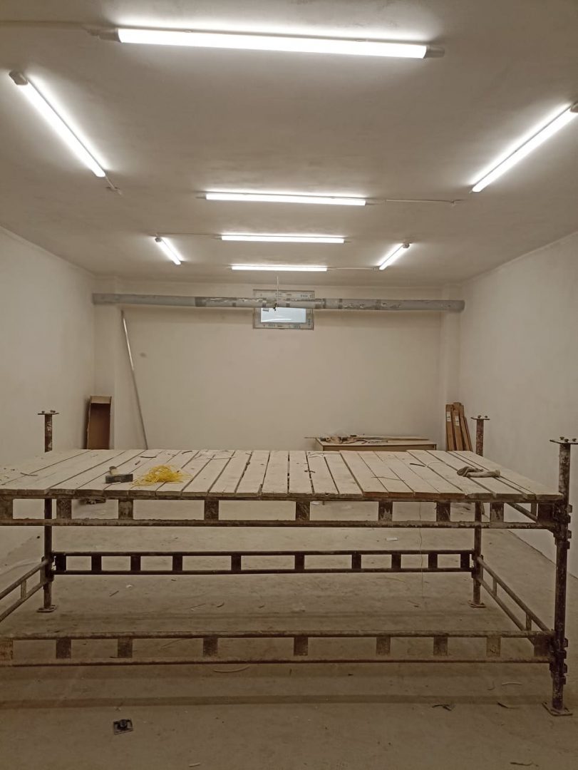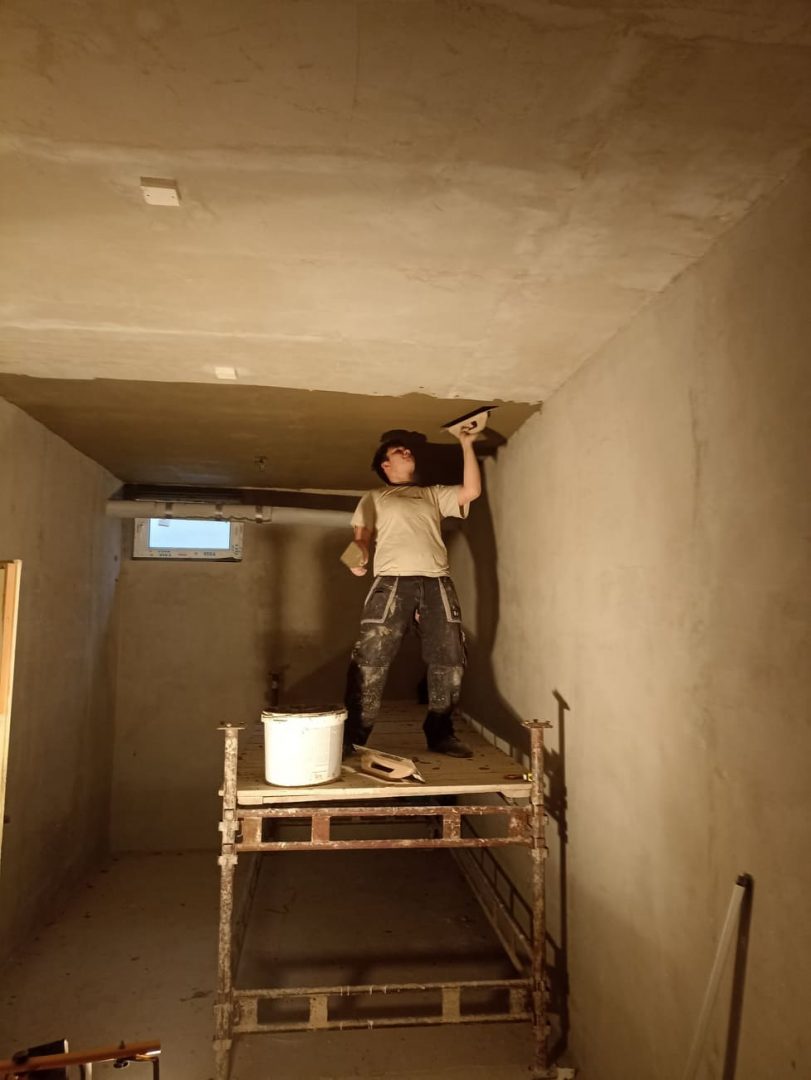 Po bouřlivém podzimu, kdy zakázka střídala zakázku, si přes zimu naší zedníci v teploučku upravují a dokončují svoje zázemí – šatny, sklad, učebnu a sociální zařízení (sprchu a WC) v suterénu DM na Čáslavské 202. S rozvodem elektrické energie a s osvětlením jim pomáhají naši elektrikáři.