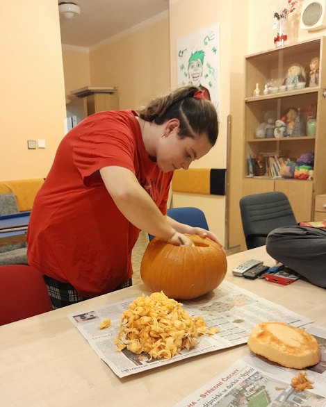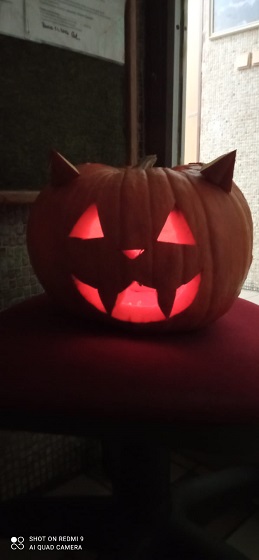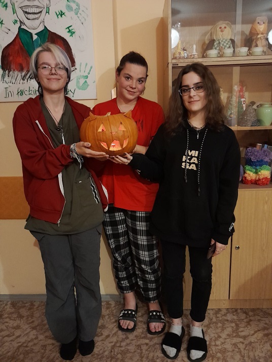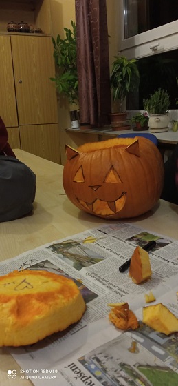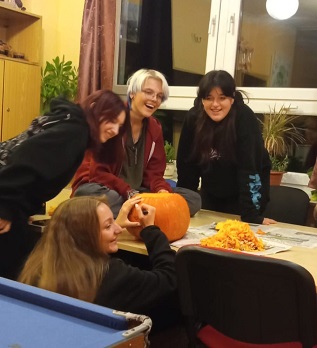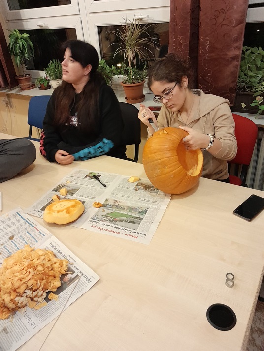 30.10. jsme strávili zábavný večer při výrobě dekorace z dýně. Všichni zúčastnění se spravedlivě podělili o práci, výběr námětu a finální vyřezání. Vznikla velmi povedená strašidelná kočka, která bude zdobit a střežit chodbu domova mládeže.