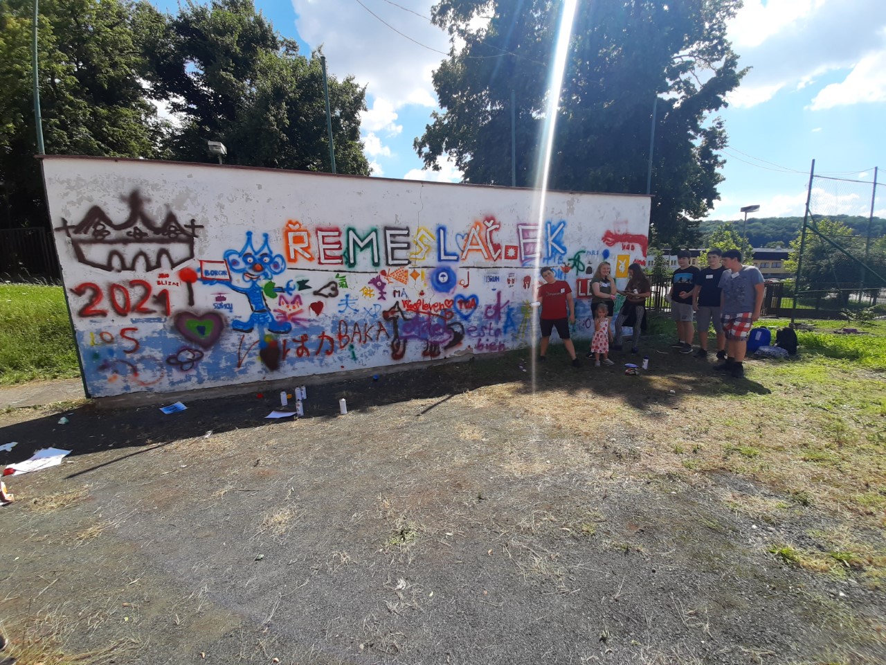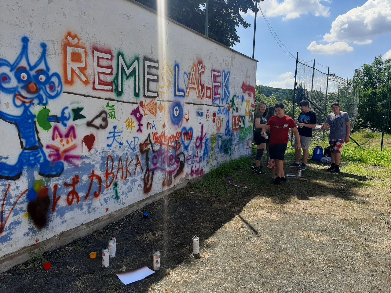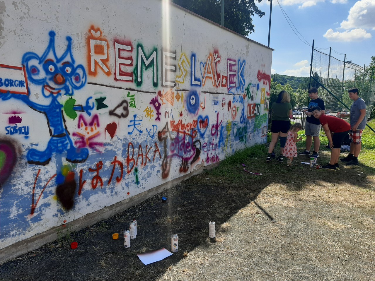 Páteční den probíhal v truhlářském duchu – nejprve ukázkou strojů a nástrojů, řezáním dřeva, zatloukáním hřebíků a ve finále sestavili košíček pro maminku. Závěrečné odpoledne bylo v duchu sprejerské kreativní aktivity na připravené zděné ploše. Mladí „graffiti“ nám s radostí vyzdobili tenisovou stěnu s pomocí šablon, které si sami připravili.