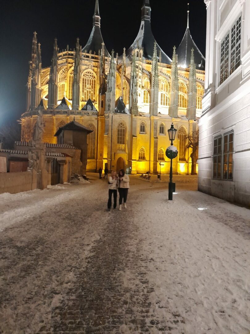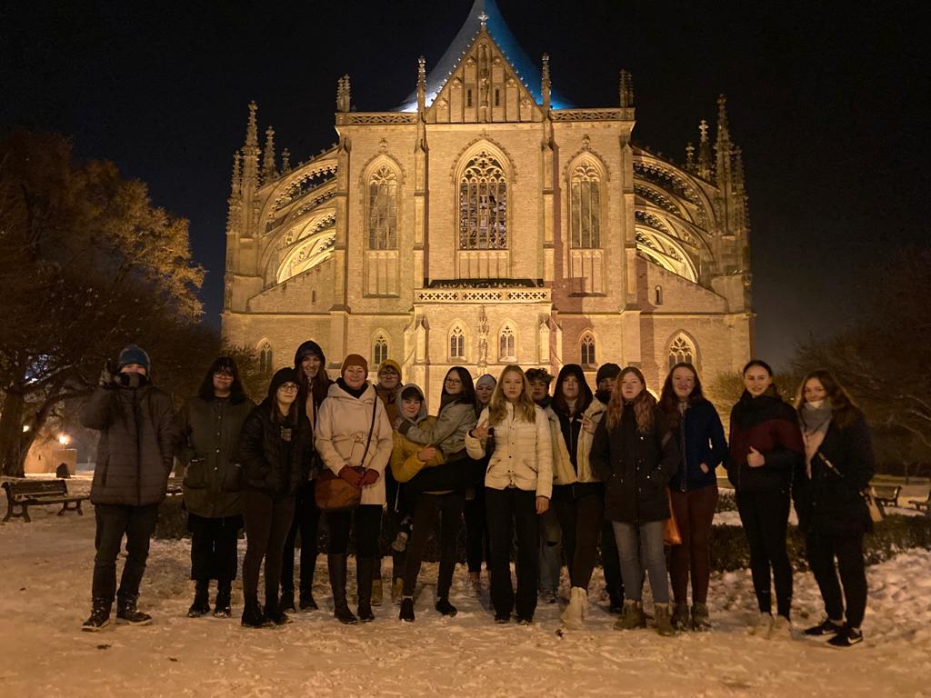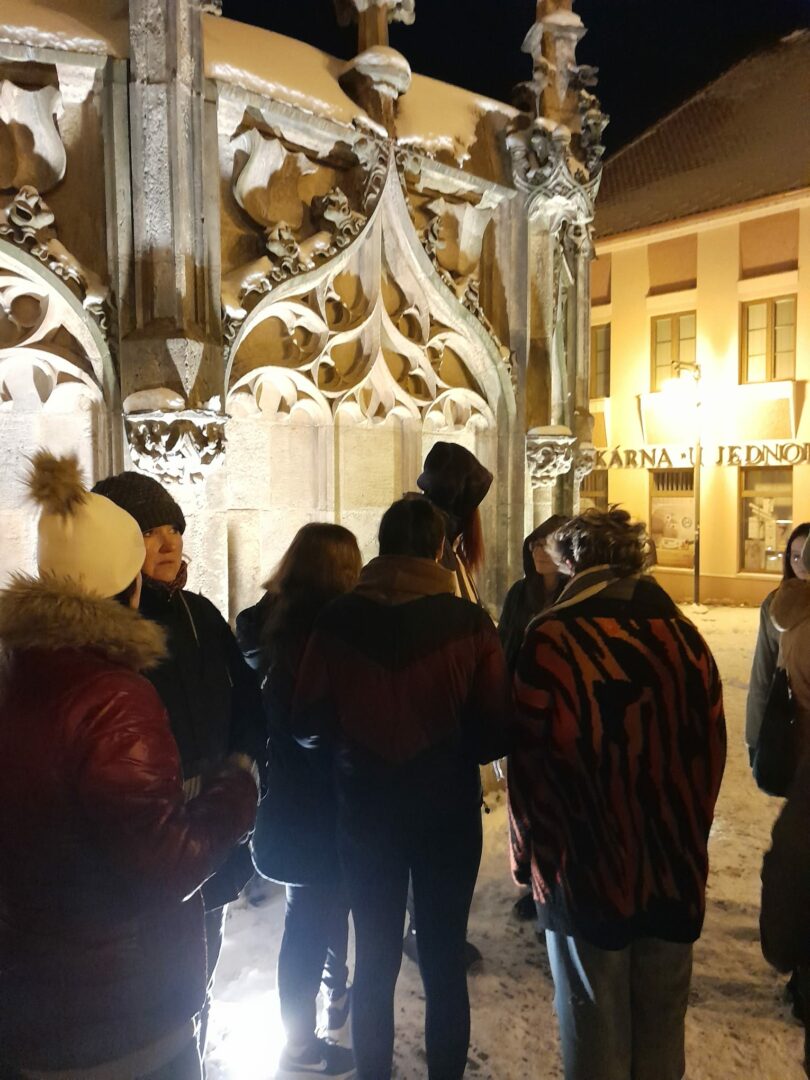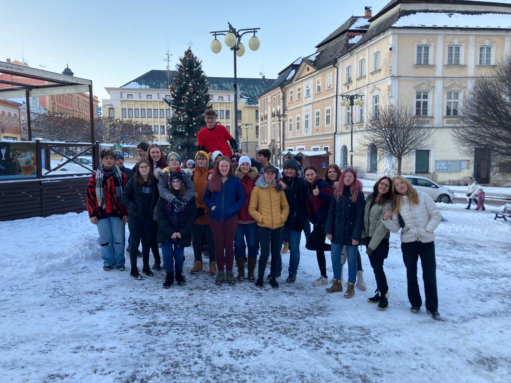 V úterý 13.12. nás navštívily žákyně spřátelené střední školy chovu koní a jezdectví z Kladrub nad Labem. Spolu s našimi žáky domova mládeže jsme prošli starobylou část Kutné Hory, zastavili se u morového sloupu a kašny, ukázali jsme děvčatům naši žákovskou restauraci a pobočku U Rytířů. Další cesta vedla k monumentální katedrále sv. Barbory, podél jezuitské koleje k Vlašskému dvoru. Cestou jsme si řekli pár zajímavostí z historie a vrátili jsme se na DM.