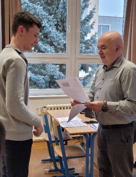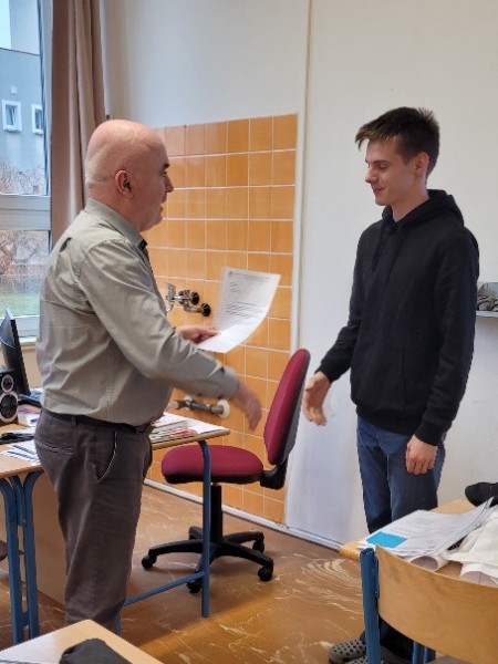 28.1.2026 pan ředitel školy s radostí přišel do třídy ME4, aby zde udělil Pochvalu ředitele školy Jaroslavu Záklasníkovi a Martinu Svobodovi za organizaci maturitního plesu třídy ME4. Oba chlapci byli organizačním motorem celého plesu a svým neskutečným úsilím dokázali společně se svými spolužáky připravit velmi příjemný večer. Pochvala patří i ostatním žákům, kteří složili plesovou maturitu svým přístupem a vystupováním po dobu celého plesu.