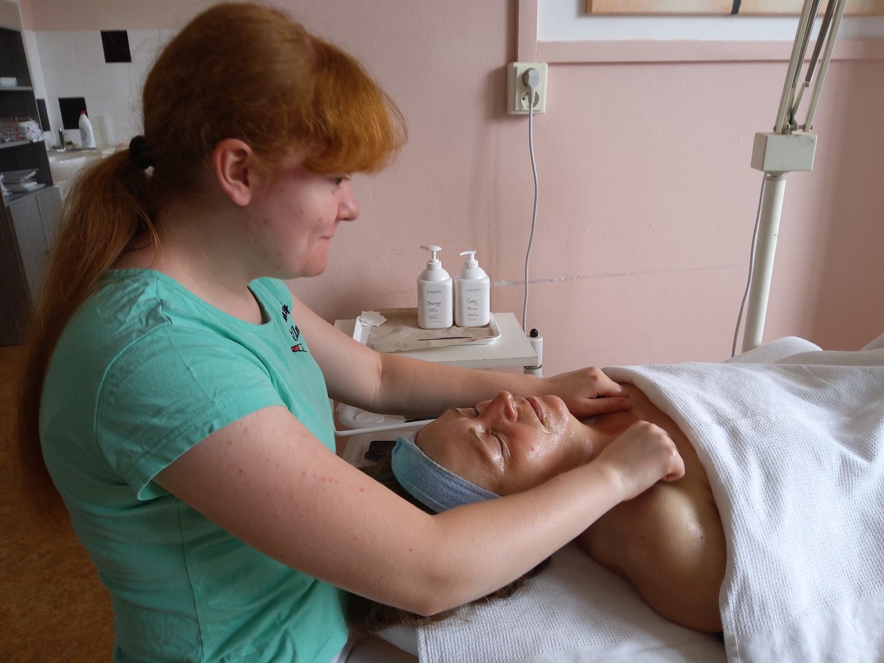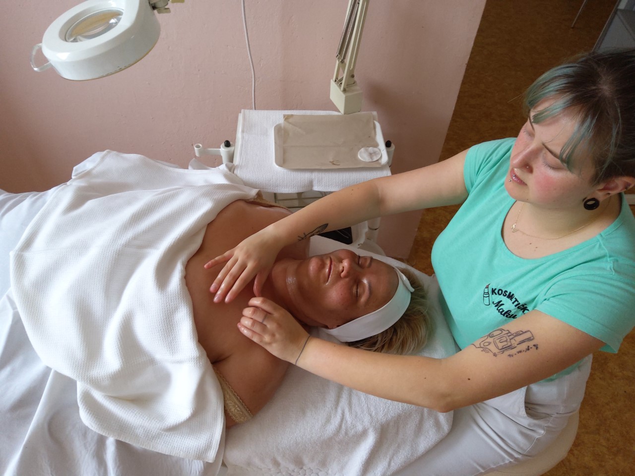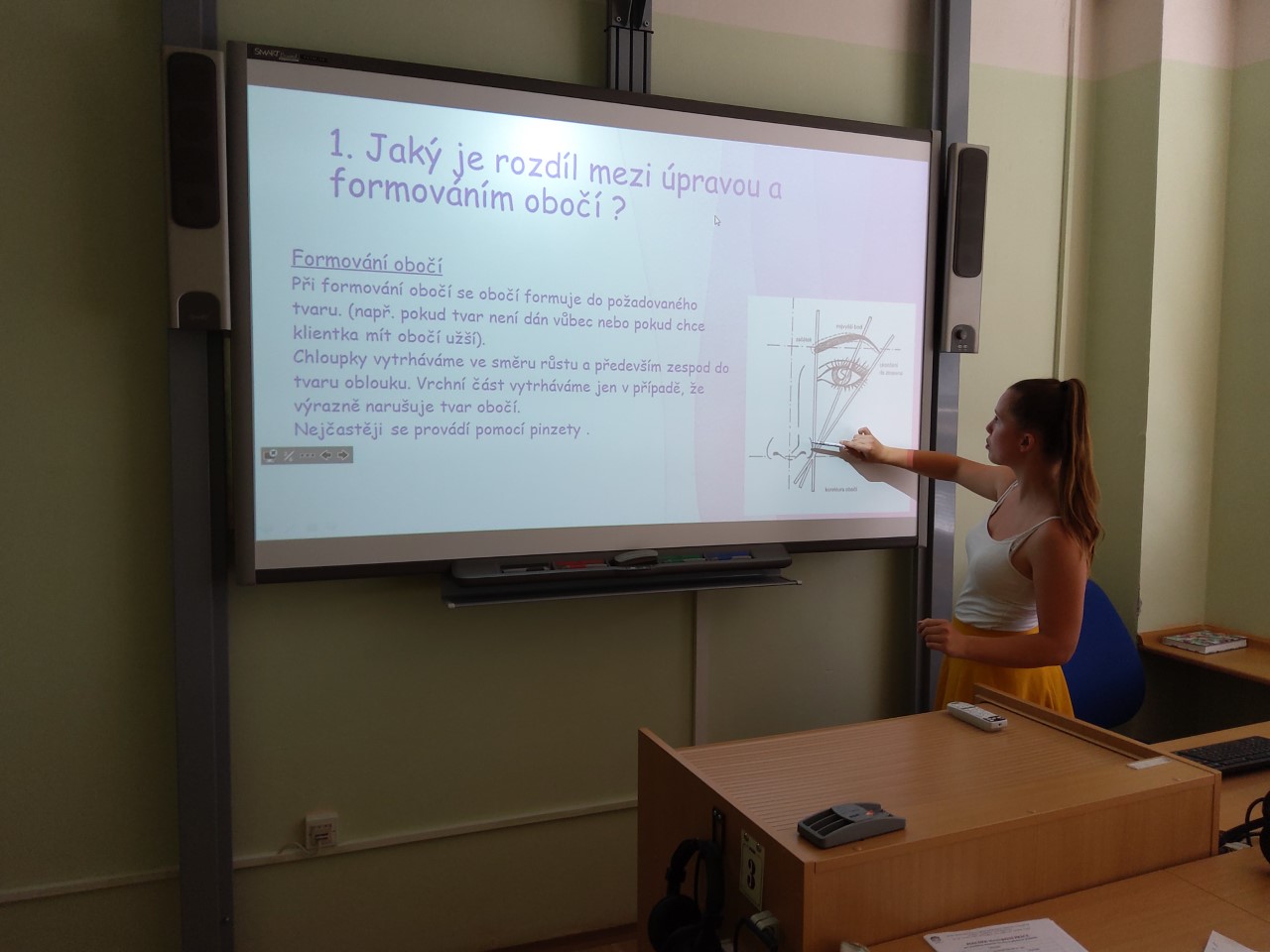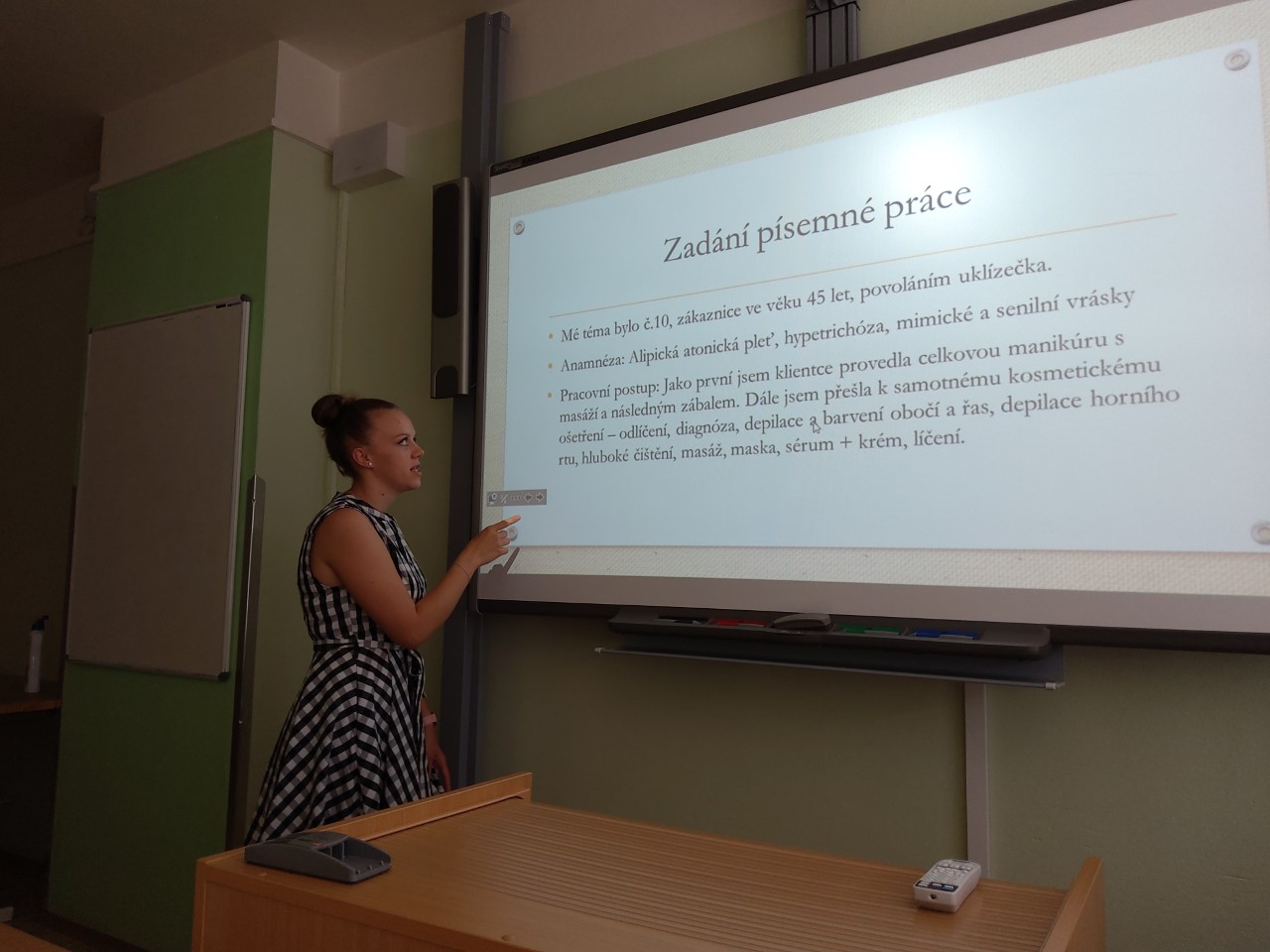 V letošním školním roce probíhají praktické maturity v naší škole v dost neobvyklý čas. Děvčata se musela obrnit velkou trpělivostí, protože ve vedrech přes třicet stupňů Celsia předkládala k posouzení své dovednosti v kosmetickém oboru- od čištění pleti přes kosmetickou diagnózu, úpravu a formování obočí, barvení obočí, masáž a masku až po zkrášlení –vizážistiku modelek. Ale ke krásné ženě náleží i krásně upravené ruce – takže manikúra a do otevřených sandálů i krásně provedená pedikúra. Na závěr jsme si vyslechly obhajoby maturitních prací našich kosmetiček. Posuďte sami, jak se jim praktická maturita povedla.