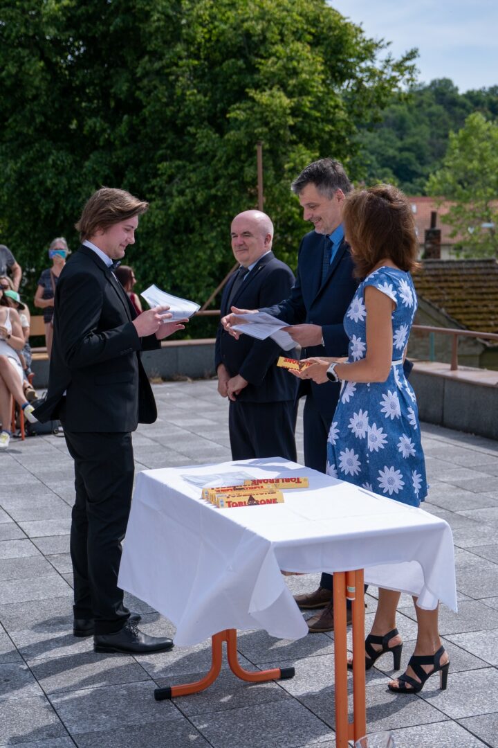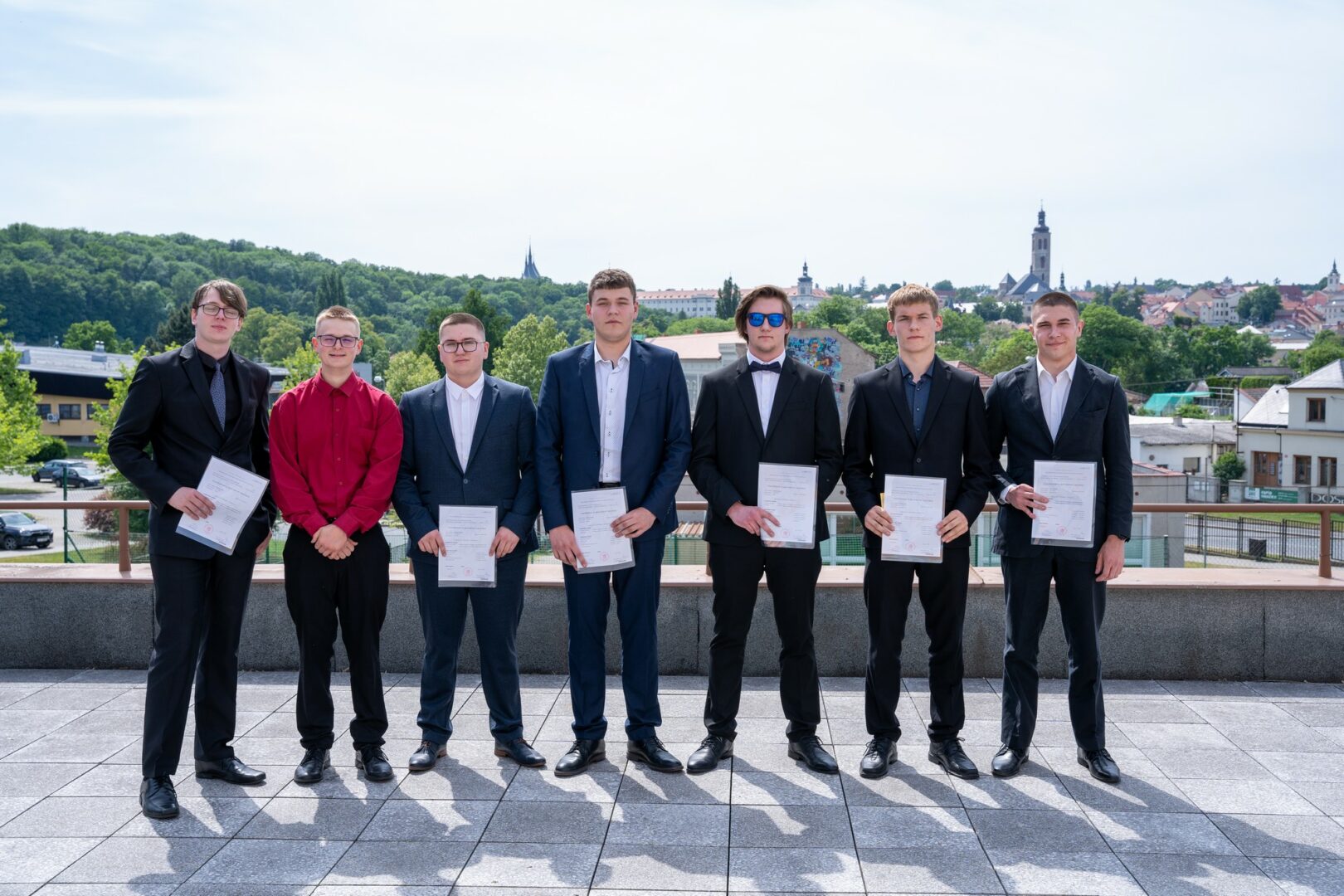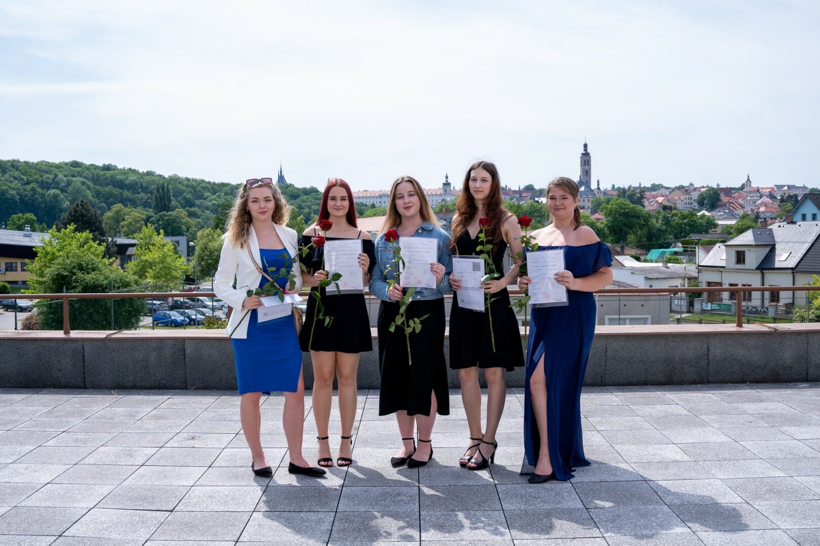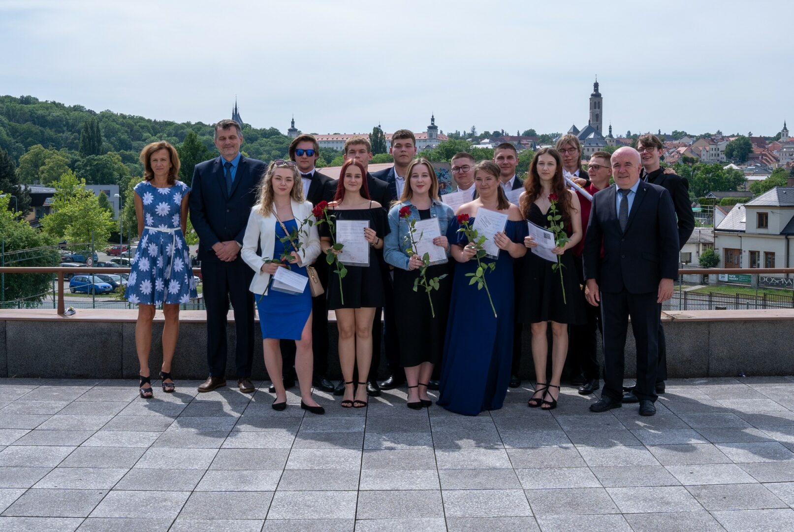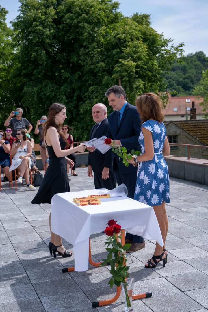 Krásné slunné počasí s výhledem na historickou část města, podtrhlo radostnou atmosféru slavnostního odpoledne v naší škole. Studijní léta skončila a začíná dospělý život. Hodně štěstí.