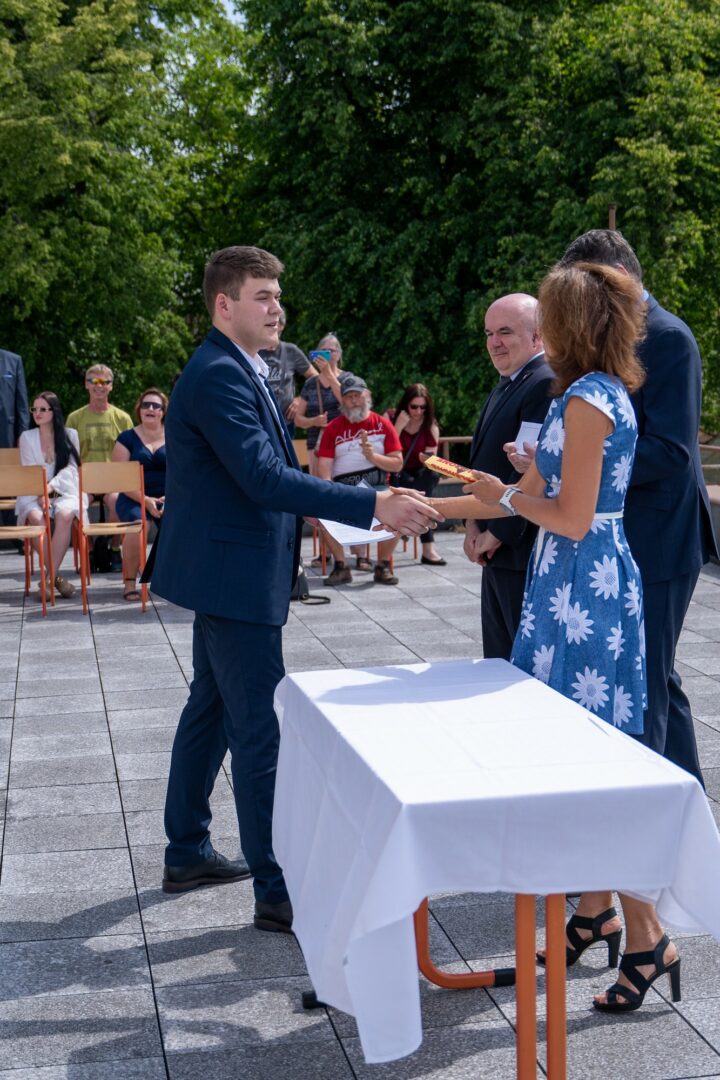 Dne 1.6.2023 proběhlo slavnostní předání maturitních vysvědčení úspěšným absolventům studia oborů Kosmetické služby a Mechanik elektronik. Za přítomnosti rodinných příslušníků úspěšných žáků, zástupců pedagogů a vedení školy zhodnotil pozitivně ředitel školy Ing. Josef Vavřinec celý průběh a výsledky maturit, popřál nyní již bývalým žákům hodně úspěchů v jejich životě. Třídní učitel Mgr. Ladislav Exner poděkoval všem žákům za jejich přístup ke studiu a předal jim maturitní vysvědčení. Ti žáci, kteří maturovali s vyznamenáním obdrželi od školy poukázku na nákup pomůcek pro svůj obor.