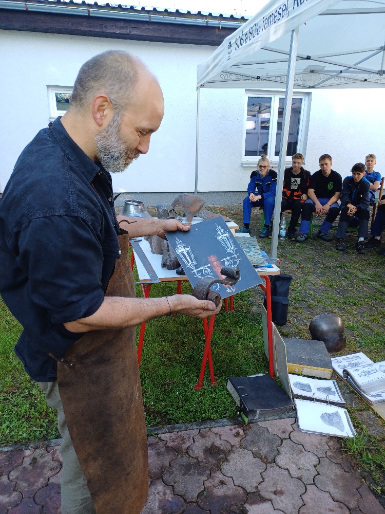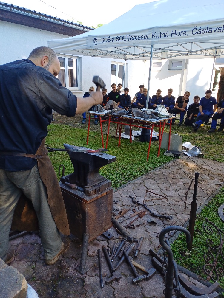 Dne 29.5.2024 jsme v SOŠ a SOU řemesel v Kutné Hoře přivítali uměleckého kováře pana Zdeňka Grausama z Úval. Představil nám možnosti uplatnění se v oboru a předvedl výsledky své řemeslné práce. Využívá tradiční postupy a snaží se maximálně využívat staré materiály. Předvedl nám své výrobky, které je schopen vytvořit recyklací ze starého nářadí, zničených nástrojů, hřídelí z vozidel apod. Příklady jeho realizací jsou velmi inspirativní a žáci technických oborů měli možnost poznat široké uplatnění tohoto řemesla v praxi. Od výroby kované postele, nožů, brnění až po provedení uměleckých děl přímo na zakázku. Jeho umělecký um ocenil i náš zřizovatel, který mu v minulosti udělil cenu Mistr tradiční rukodělné výroby Středočeského kraje. Poutavou formou vysvětlil žákům a učitelům odborného výcviku postupy při přípravě a samotném kování. Hlavní cílem byly praktické činnosti žáků, kdy jsme měli možnost si společně osahat tuto krásnou, ale velmi náročnou práci. Vytvořili jsme si drobné výrobky a maximálně využili jeho znalostí z oboru (v současnosti více než 22 let). Pevně věříme, že se panem Grausamem ještě setkáme a navážeme na spolupráci v jeho nové dílně, kterou si nyní připravuje.