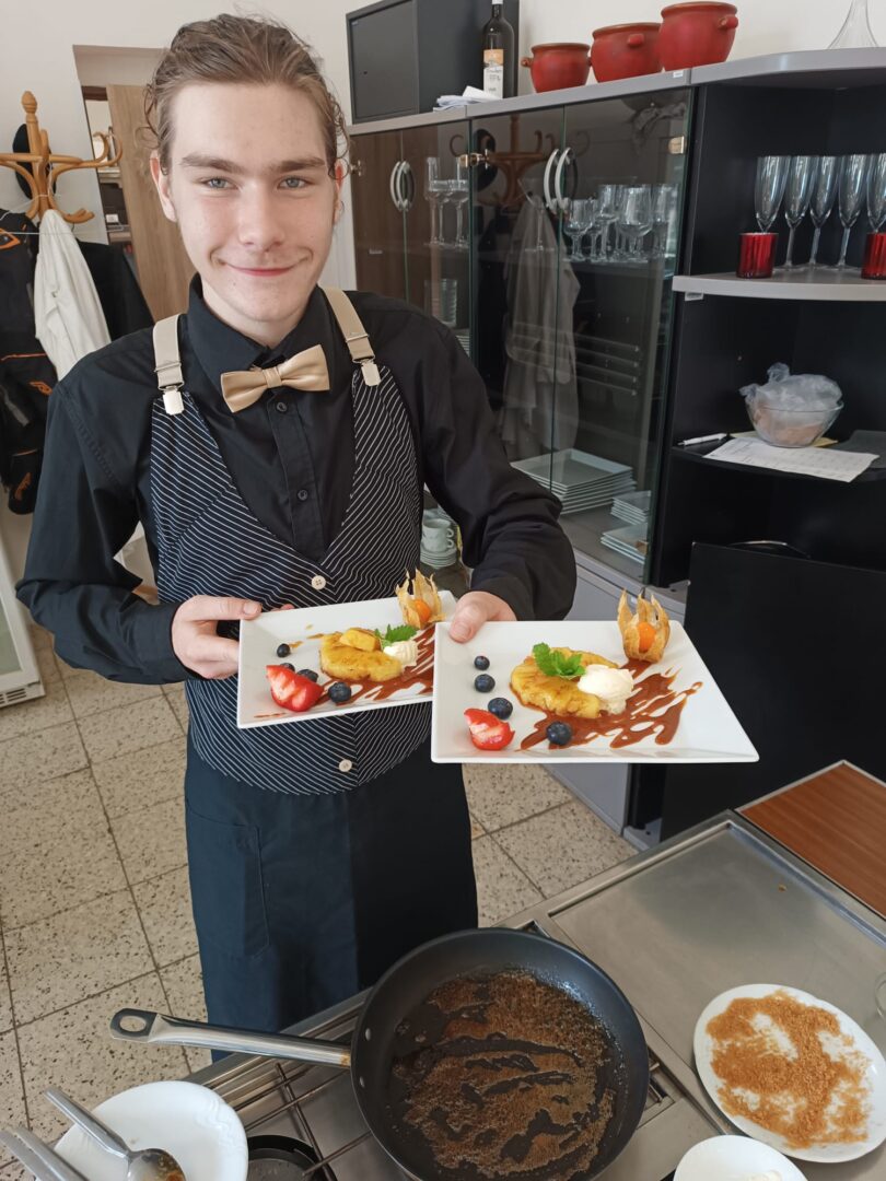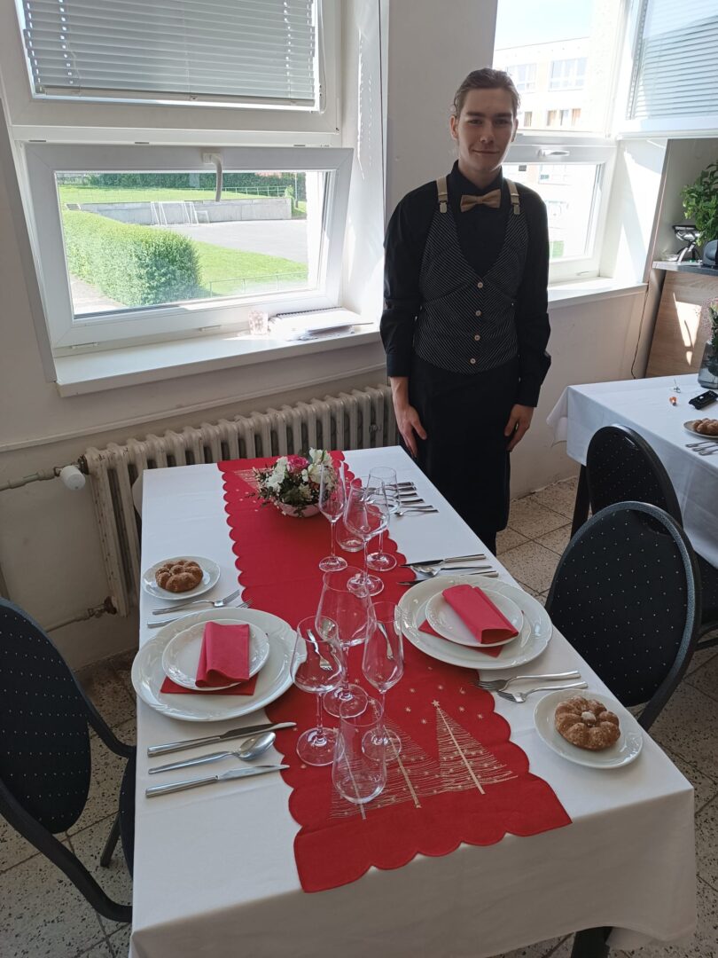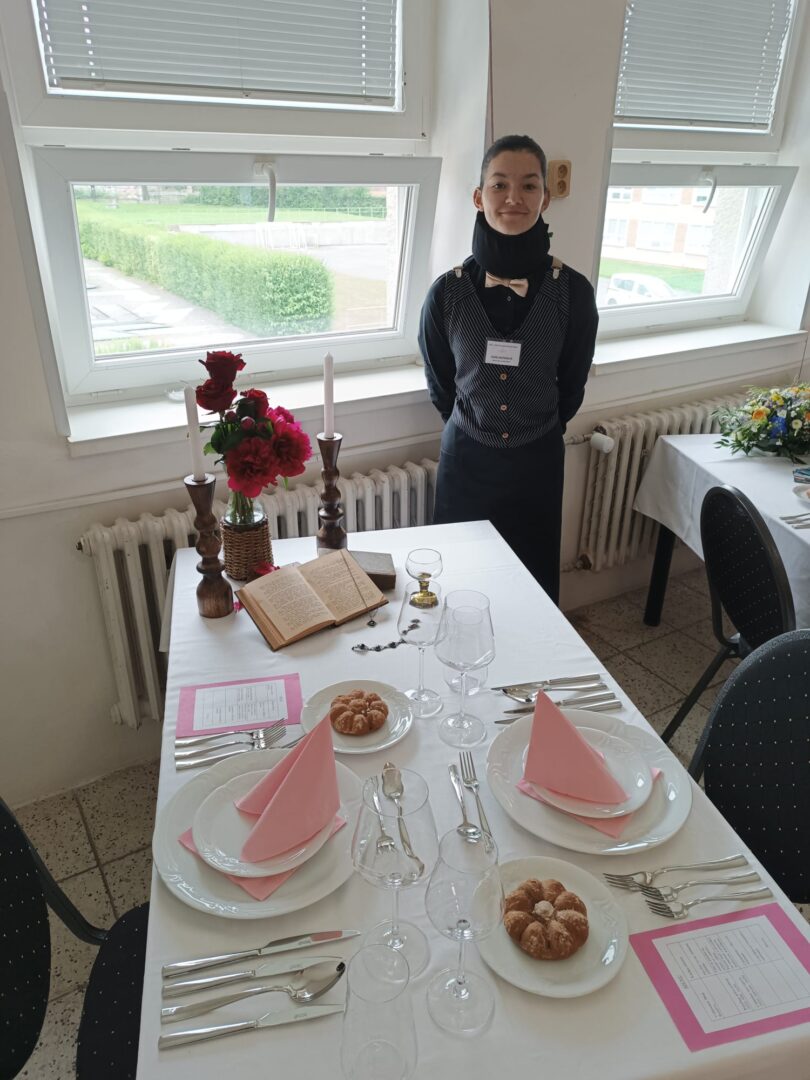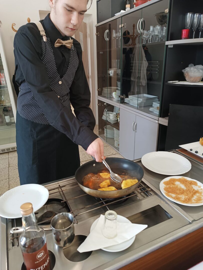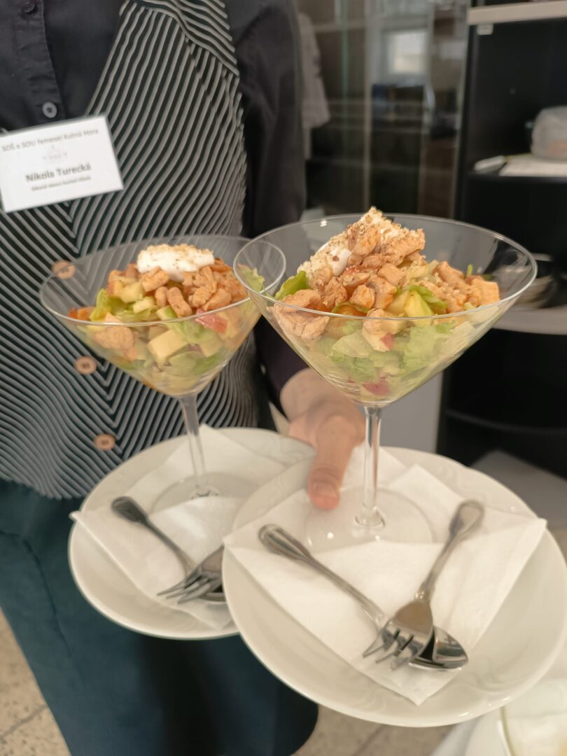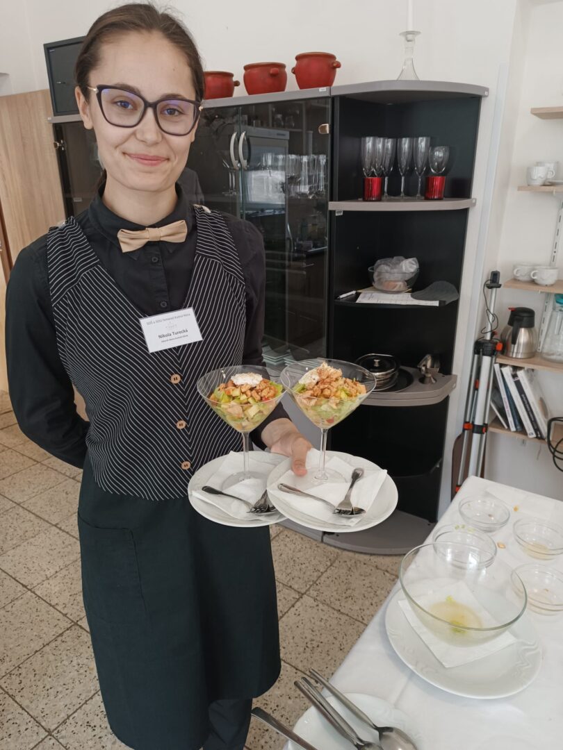 Od úterního rána, i obor kuchař-číšník rozjel závěrečné zkoušky. První skupina žáků se s losovanými úkoly a zadáním jzzz popasovala s pokorou a precizností a nasadili laťku pro své čekající spolužáky.